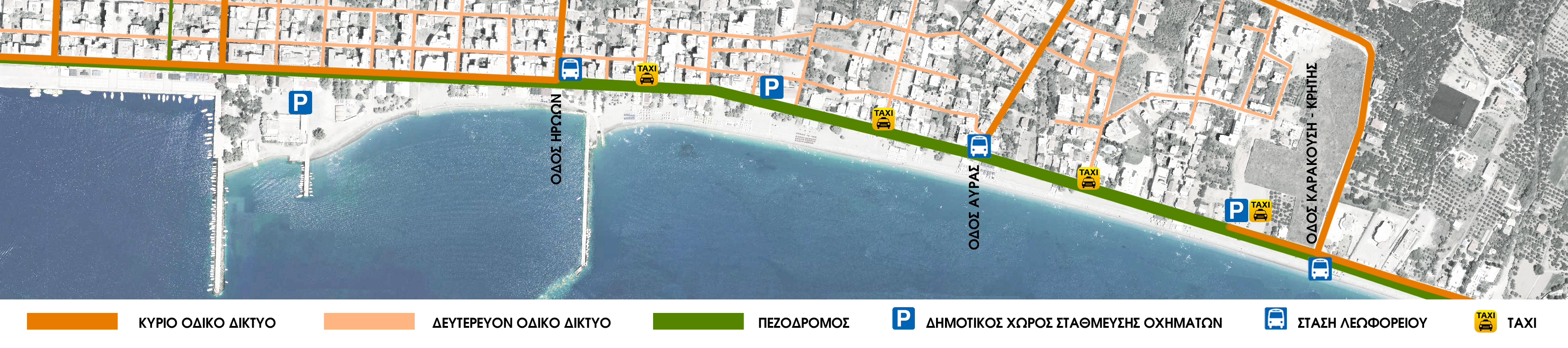 Ετσι λοιπόν, κατά τη γνώμη μας δεν τίθεται ανάγκη πεζοδρόμησης του τμήματος από το λιμένα έως την Ηρώων. Το οδικό δίκτυο είναι φορτωμένο, ενώ υπάρχει πλατύ πεζοδρόμιο που εξυπηρετεί πεζούς και ποδηλάτες. Προτείνουμε την πεζοδρόμηση της Ναυαρίνου από την Ηρώων έως την Κρήτης, που αποτελεί τμήμα με μεγάλη επισκεψιμότητα λουομένων και εκτενή αμμουδιά. Τα υπάρχοντα πεζοδρόμια διατηρούνται και ο ενδιάμεσος χώρος αποδίδεται στην ανάπτυξη τραπεζοκαθισμάτων και στη διάνοιξη ποδηλατοδρόμου και ζωνών πρασίνου. Ο ποδηλατόδρομος έχει επαρκές πλάτος ώστε να δύναται να εξυπηρετήσει τη διέλευση οχημάτων εκτάκτου ανάγκης (π.χ. ασθενοφόρο) αλλά και οχημάτων τροφοδοσίας καταστημάτων σε συγκεκριμένες πρωινές ώρες.