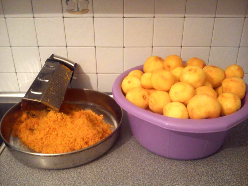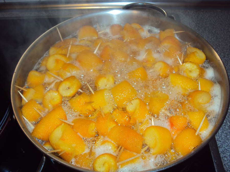 Τα διπλώνουμε ρολλάκια και τα βάζουμε μια οδοντογλυφίδα για να σταθεί. Γεμίζουμε μία λεκάνη με κρύο νερό και βάζουμε τις φλούδες από πάνω βάζουμε ένα πιάτο γιατί επιπλέουν τα φήνουμε 24 ώρες αλλάζοντας συχνά το νερό. Την επόμενη μέρα βάζουμε σε κατσαρόλα νερό να βράσει και ρίχνουμε τις φλούδες να βράσουν για 10 λεπτά.