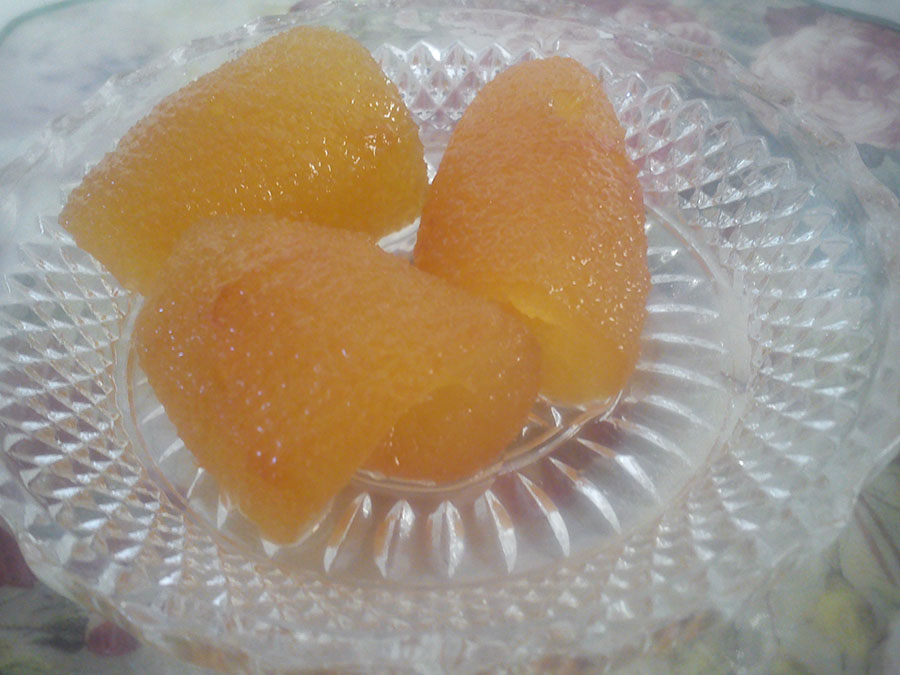 Υλικά: 1500 γρ. φλούδες νερατζιού, 1500 γρ. ζάχαρη, 3 φλυτζάνια νερό, χυμό λεμονιού.