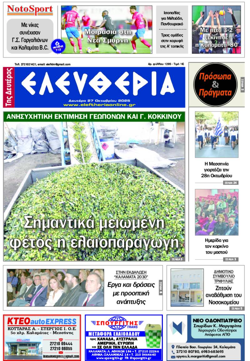 Το πρωτοσέλιδο της "Ελευθερίας της Δευτέρας" - 27 Οκτωβρίου 2025