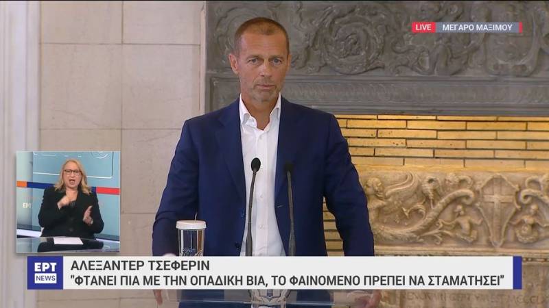 «Όλοι είμαστε λυπημένοι και εξαγριωμένοι λόγω αυτών των φοβερών που συνέβησαν, λόγω της παράλογης βίας γιατί κάποιοι χρησιμοποιούν το ποδόσφαιρο για να ασκήσουν βία. Τι είδους άνθρωπος επιτίθεται σε έναν άλλο λόγω φανέλας; Αυτός είναι ο καρκίνος του ποδοσφαίρου. Μην τους λέτε οπαδούς. Είναι αυτοί που χρησιμοποιούν βλακωδώς τις ιδέες τους. Φτάνει πια. Αυτό πρέπει να σταματήσει και θα σταματήσει. Η βία και ο χουλιγκανισμός δεν είναι πρόβλημα μόνο της Ελλάδας αλλά και της Ευρώπης και πέραν αυτής» τόνισε χαρακτηριστικά ο κ. Τσεφέριν κάνοντας αναφορά στα αιματηρά επεισόδια της Νέας Φιλαδέλφειας.