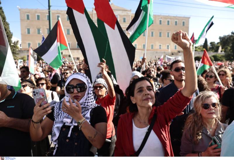 Το συλλαλητήριο στο Σύνταγμα ξεκίνησε με τον ύμνο της Παλαιστίνης που συνέθεσε ο Μίκης Θεοδωράκης το 1981 μετά από αίτημα του ηγέτη της Οργάνωσης για την Απελευθέρωση της Παλαιστίνης, Γιάσερ Αραφάτ, στην τότε επίσκεψή του στην Ελλάδα, ενώ η μουσική σύνθεση του Μ. Θεοδωράκη εγκρίθηκε αργότερα από την παλαιστινιακή Βουλή, ώστε να αποτελέσει τον επίσημο ύμνο του Παλαιστινιακού Κράτους όταν επιτευχθεί η επίσημη ίδρυσή του.
