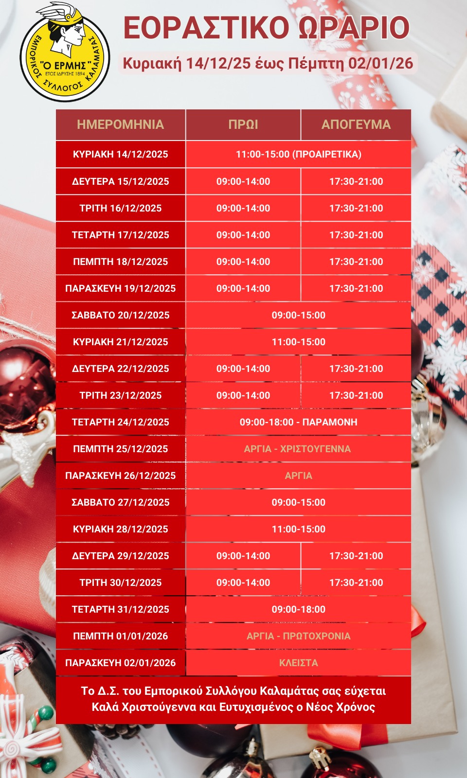 Στις 25, 26 Δεκεμβρίου και 1 Ιανουαρίου τα καταστήματα θα είναι κλειστά.