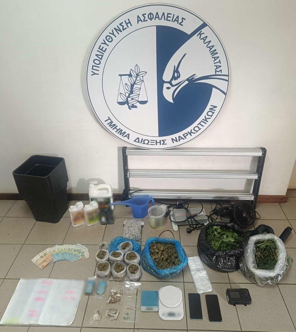 Ακόμη κατασχέθηκαν 2.159 κιλά ακατέργαστη κάνναβη (φούντα, κλώνοι και φύλλα), 246,2 γραμμάρια κατεργασμένης κάνναβης, σε μορφή «σοκολάτας» και «βούτυρου», δύο ζυγαριές, το χρηματικό ποσό των 1.360 ευρώ, ως προερχόμενο από τη διακίνηση των ναρκωτικών, δύο κινητά τηλέφωνα, πλήθος νάιλον συσκευασίες, εξοπλισμό αποθήκευσης και εσωτερικής καλλιέργειας κάνναβης (ανεμιστήρες, ιονιστής, λιπάσματα, λαμπτήρες) και ιδιόχειρες σημειώσεις, σχετικές με την καλλιέργεια φυτών κάνναβης. Η δράση του εκτιμάται πως θα του απέφερε κέρδη που θα έφταναν τα 90.000 ευρώ!