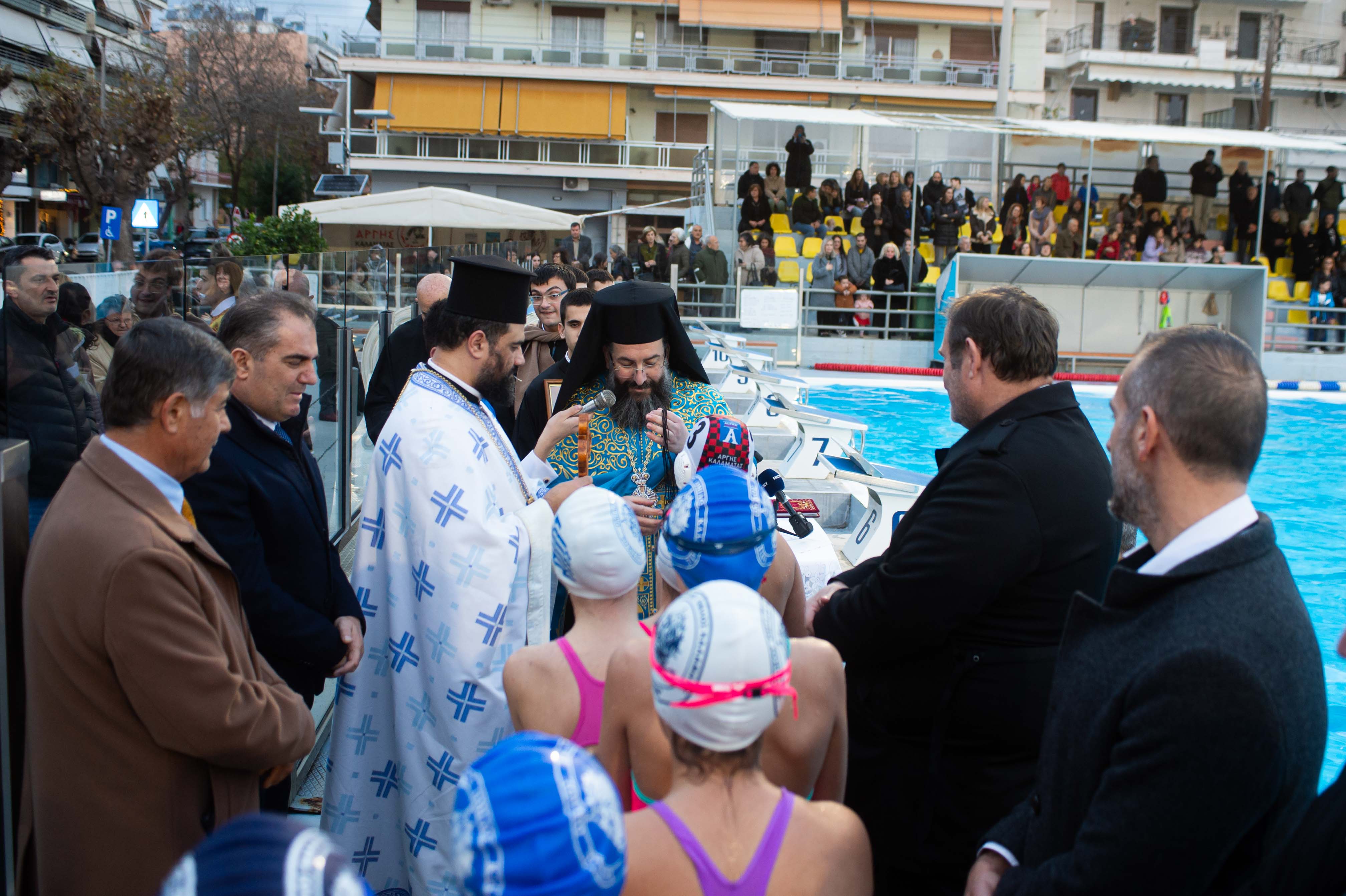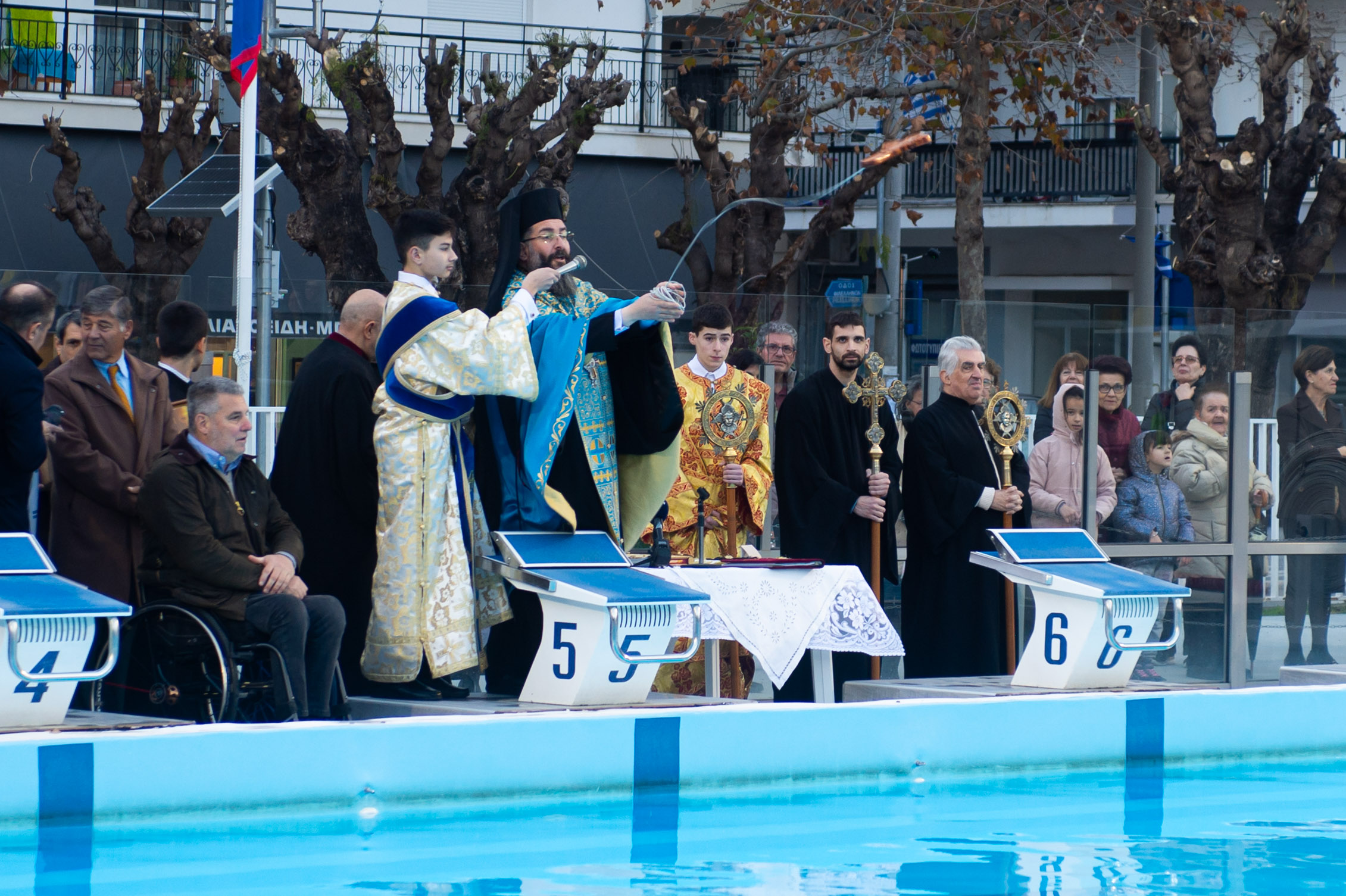 Στη συνέχεια λιτανευτική πομπή με επικεφαλής την εικόνα της Βαπτίσεως του Χριστού, έφθασε στο Δημοτικό Κολυμβητήριο Καλαμάτας, όπου πραγματοποιήθηκε η κατάδυση του Τιμίου Σταυρού, από τον π. Φίλιππο, με την συμμετοχή πολλών παιδιών από τις ομάδες που αθλούνται στο κολυμβητήριο.