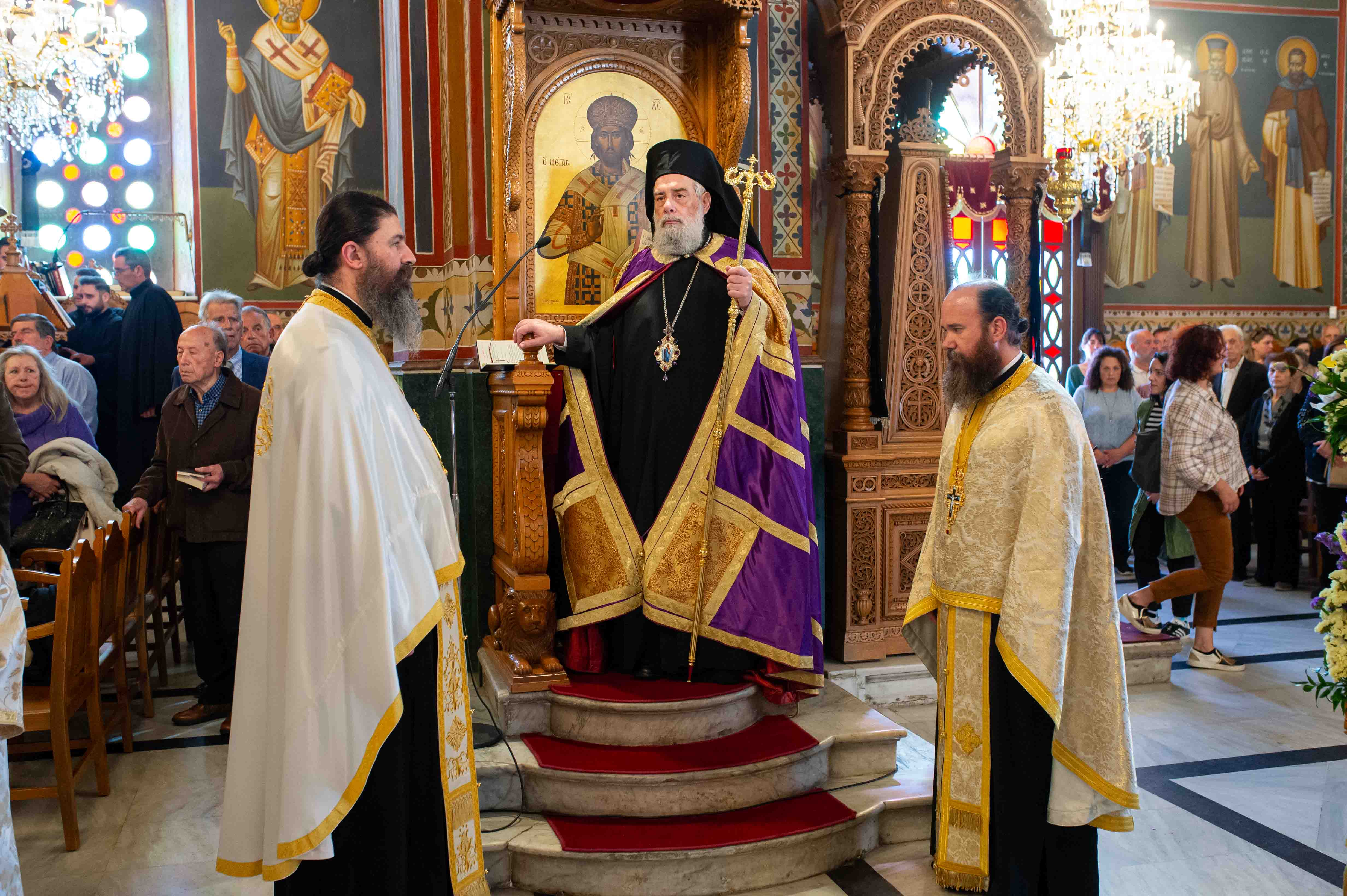 Η Ακολουθία τελέσθηκε χοροστατούντος του Μητροπολίτη Γέροντος Λεοντοπόλεως Γαβριήλ, πλαισιωμένου υπό των εφημερίων του Μητροπολιτικού Ναού και του Διακόνου Θεοφίλου Κυριάκου, ενώ την υμνολογία της ημέρας απέδωσαν μελωδικώτατα οι χοροί των ιεροψαλτών.