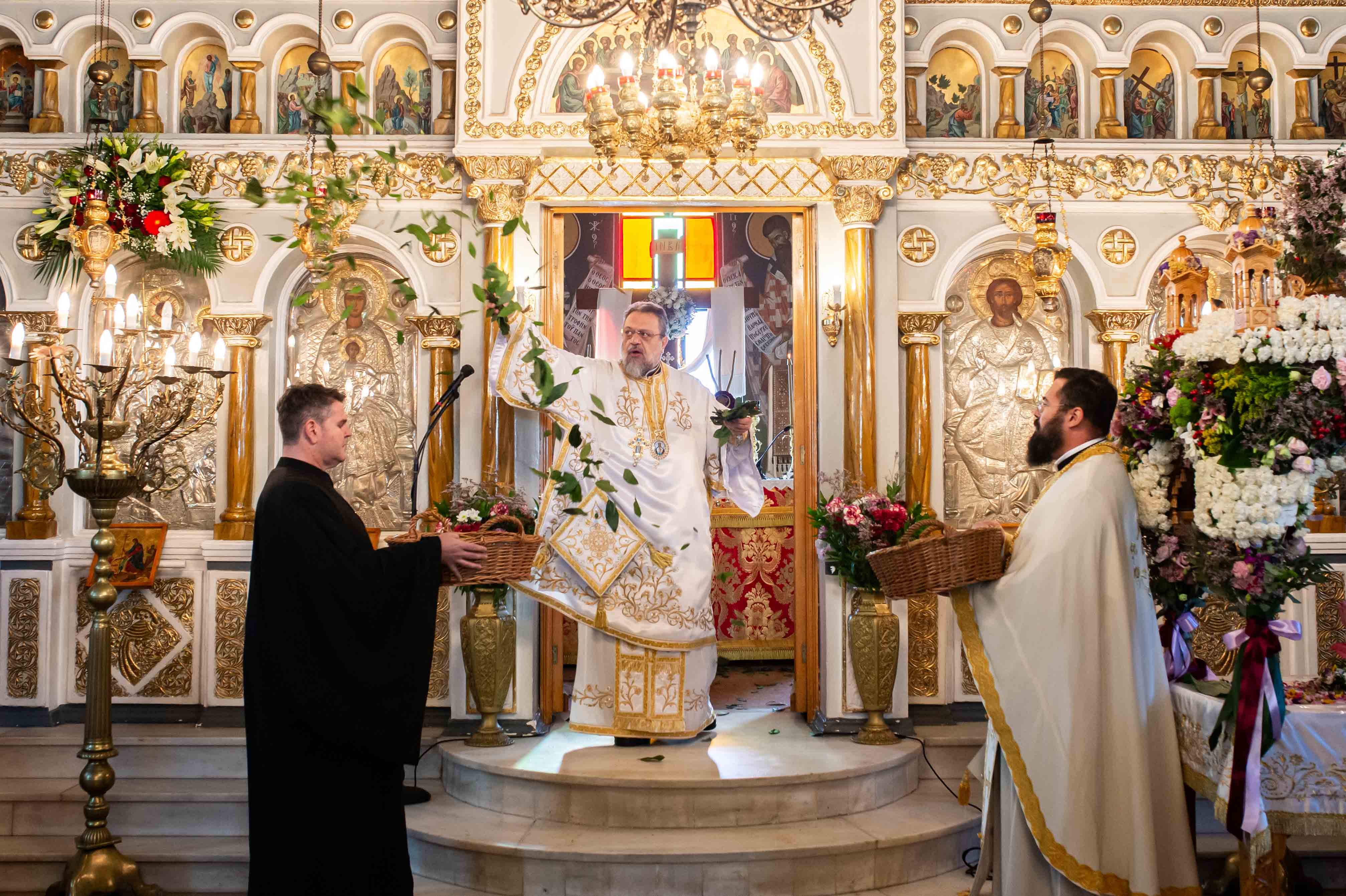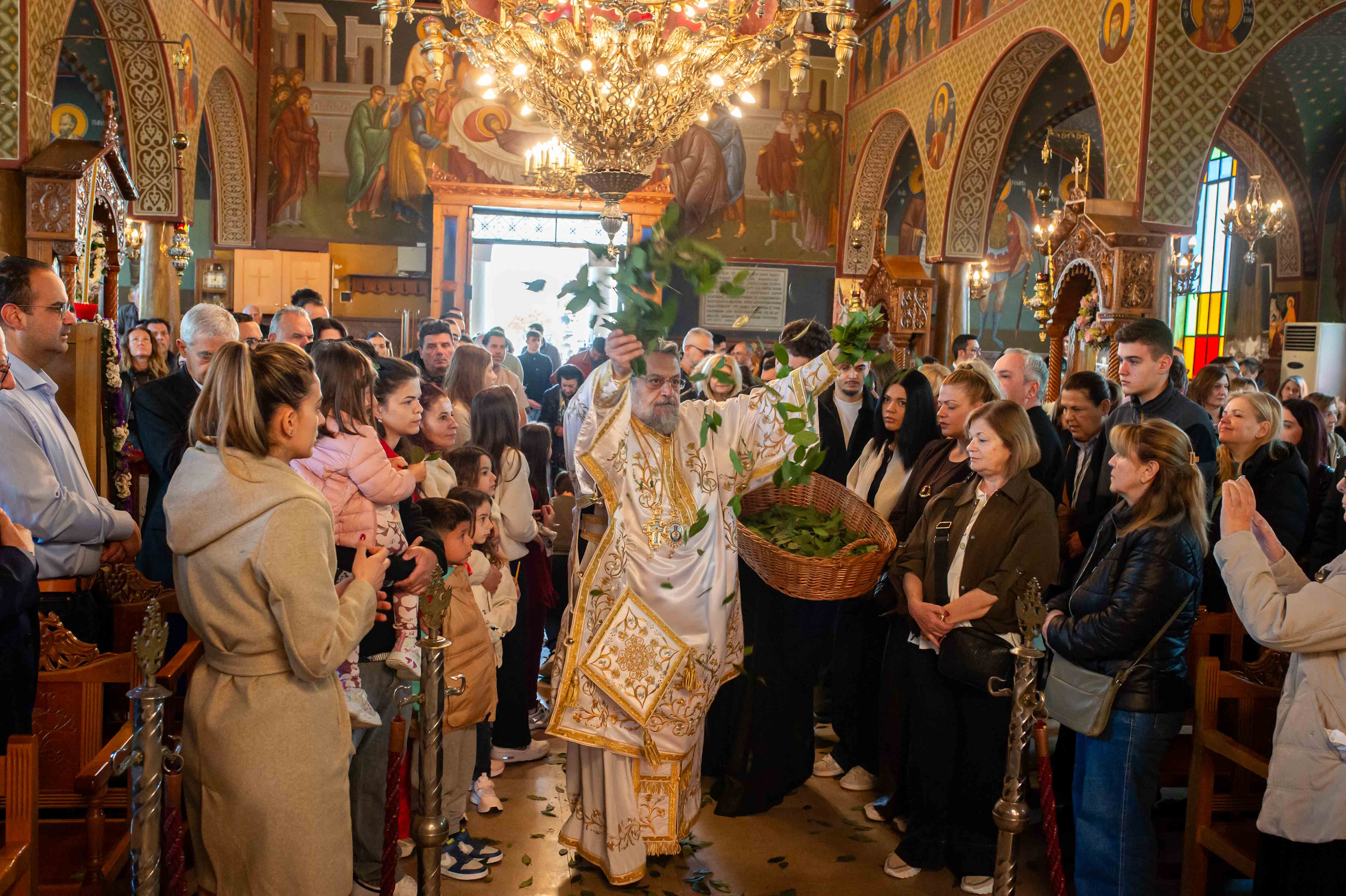 Πλήθη πιστών συμμετείχαν στην Θεία Λειτουργία και έψαλλαν τον Ύμνο των Τριών Παίδων και το Προκείμενον “Ανάστα ο Θεός”, λαμβάνοντας την ευλογία τον δαφνών, ως συμβόλων της νίκης κατά του θανάτου.