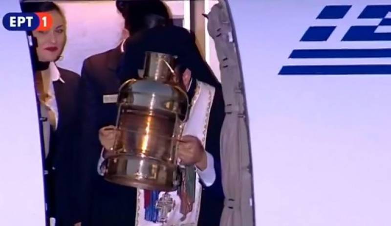 Το 'Αγιο Φως μεταφέρει στην Αθήνα ο Έξαρχος του Αγίου Τάφου εν Ελλάδι κ. Δαμιανός, ενώ η υποδοχή του θα πραγματοποιηθεί με τιμές αρχηγού κράτους από άγημα του Υπουργείου Εθνικής 'Αμυνας.