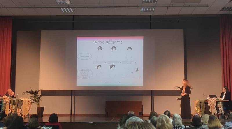 Η Δήμητρα Σαράντου μαία MScΓΝ Μεσσηνίας και η Χρυσούλα Χριστοπούλου μαία ΓΝ Μεσσηνίας, αναφέρθηκαν στην αυτοεξέταση του μαστού και τη σημασία που έχει στον εντοπισμό της νόσου, επεσήμαναν ότι είναι σημαντικό να γίνεται μια φορά τον μήνα, εξήγησαν με ποιον τρόπο πρέπει να γίνεται και υπογράμμισαν ότι όσο πιο συχνά επαναλαμβάνεται τόσο πιο εύκολο γίνεται, αλλά και ότι πρέπει οι γυναίκες να αφιερώνουν δέκα λεπτά στον εαυτό τους.