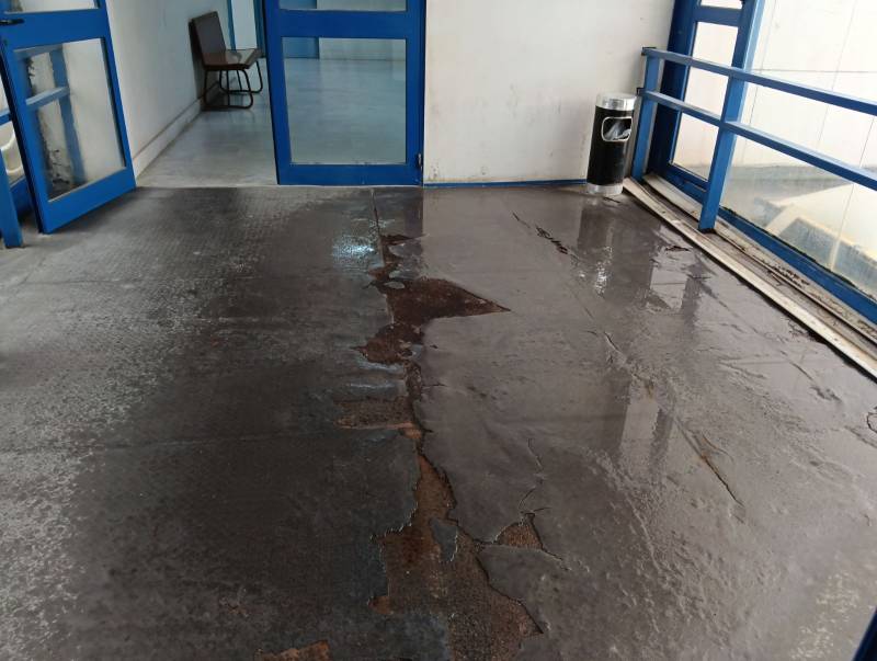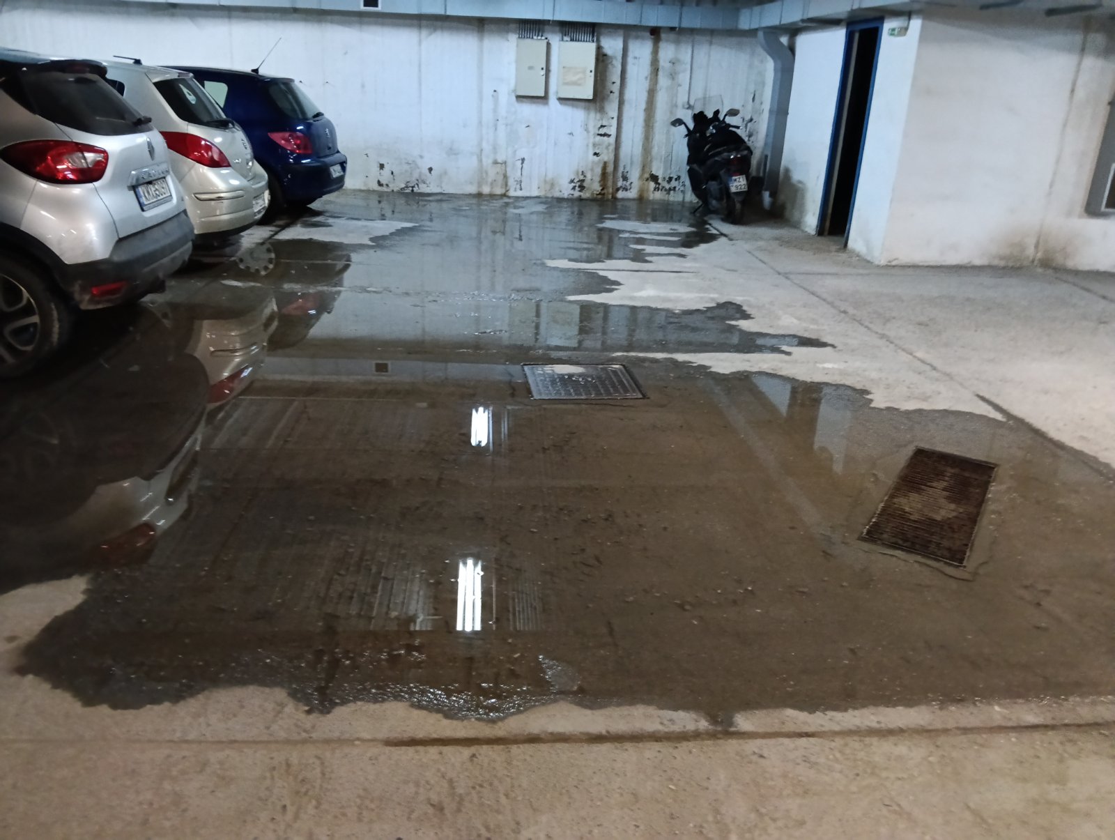 Από το υπόγειο και το ισόγειο μέχρι τον 1ο και τον 2ο όροφο, είχαν σχηματιστεί “λίμνες” και το νερό της βροχής συνέχιζε να πέφτει στο εσωτερικό του κτηρίου και πάνω στον κόσμο που κυκλοφορούσε σε αυτό.