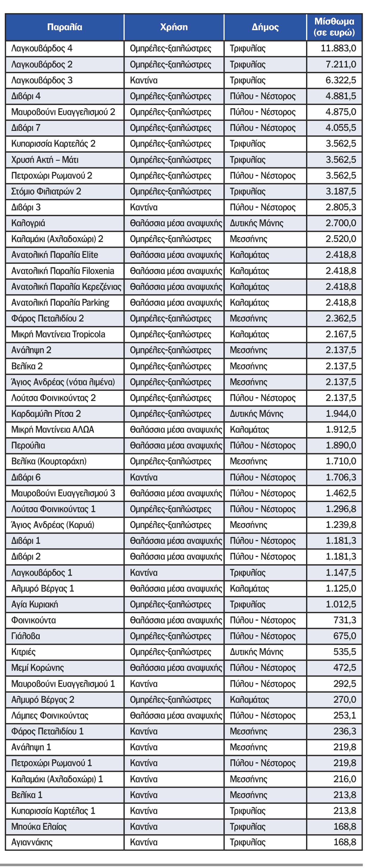 Με μεγάλες αποκλίσεις στα μισθώματα και σημαντικό αριθμό άγονων δημοπρασιών ολοκληρώθηκε η διαδικασία παραχώρησης παραλιών στη Μεσσηνία για το 2026, αποτυπώνοντας μια αγορά με έντονες ανισότητες ακόμη και μέσα στην ίδια Περιφερειακή Ενότητα.