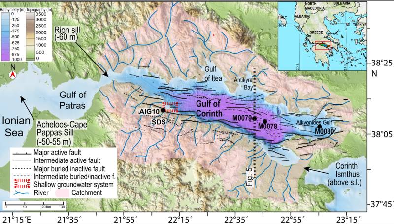 (Στη φωτογραφία χάρτης του Κορινθιακού Κόλπου και των περιχώρων του - Credit: Horozal et al)