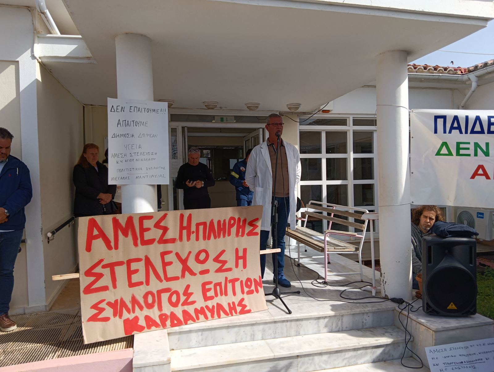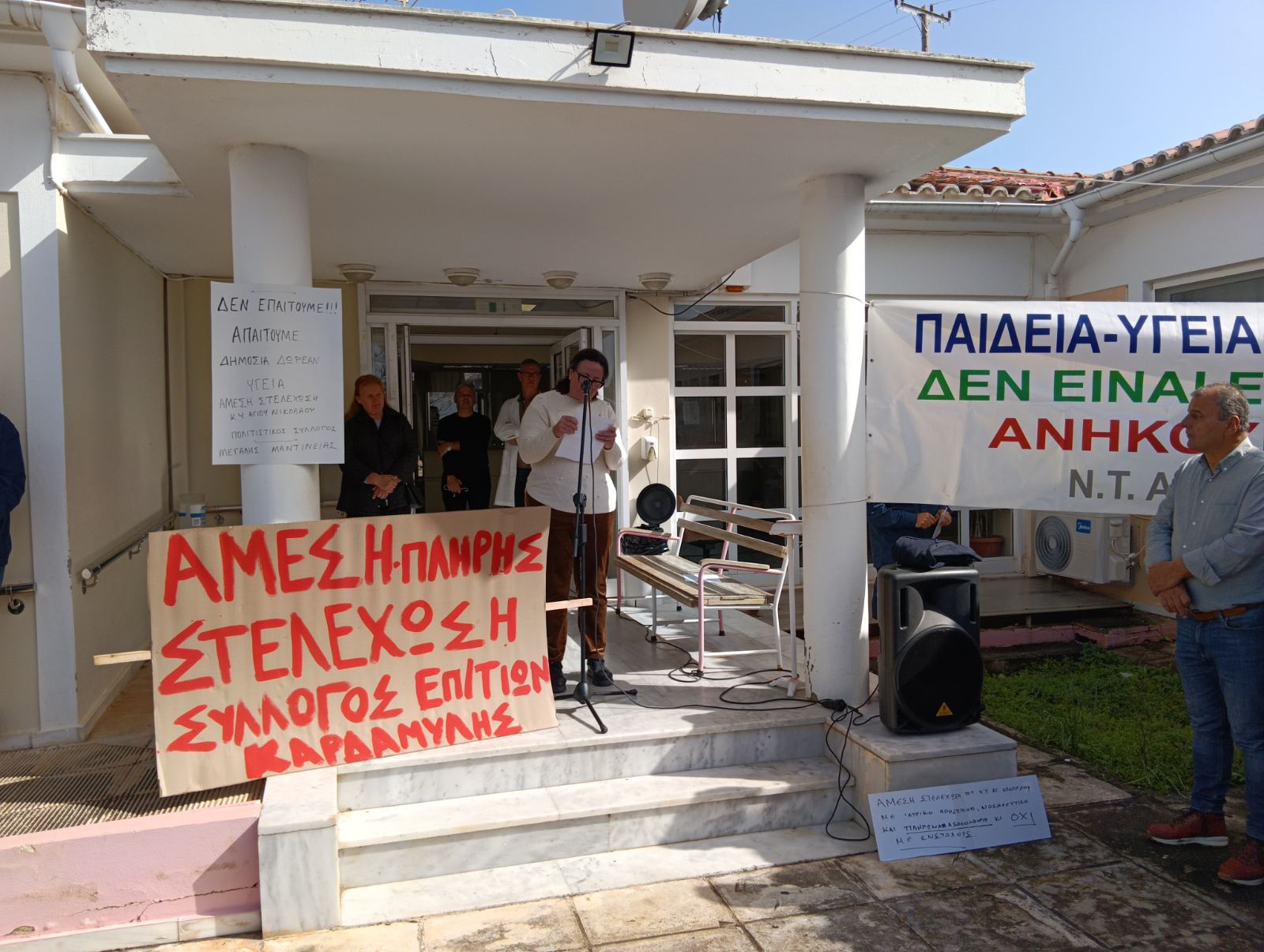 Στη συγκέντρωση μπροστά από το Κ.Υ. το πρωί του Σαββάτου, που είχε αρκετό κόσμο, διαμαρτυρήθηκε για το γεγονός ότι το κράτος εδώ και χρόνια αδιαφορεί και δεν ικανοποιεί τα δίκαια αιτήματα της περιοχής, με αποτέλεσμα κάθε χρόνο η κατάσταση να χειροτερεύει κι εξέφρασε την αποφασιστικότητά της ενωμένη να αγωνιστεί για να πετύχει τις υπηρεσίας υγείας που δικαιούται.