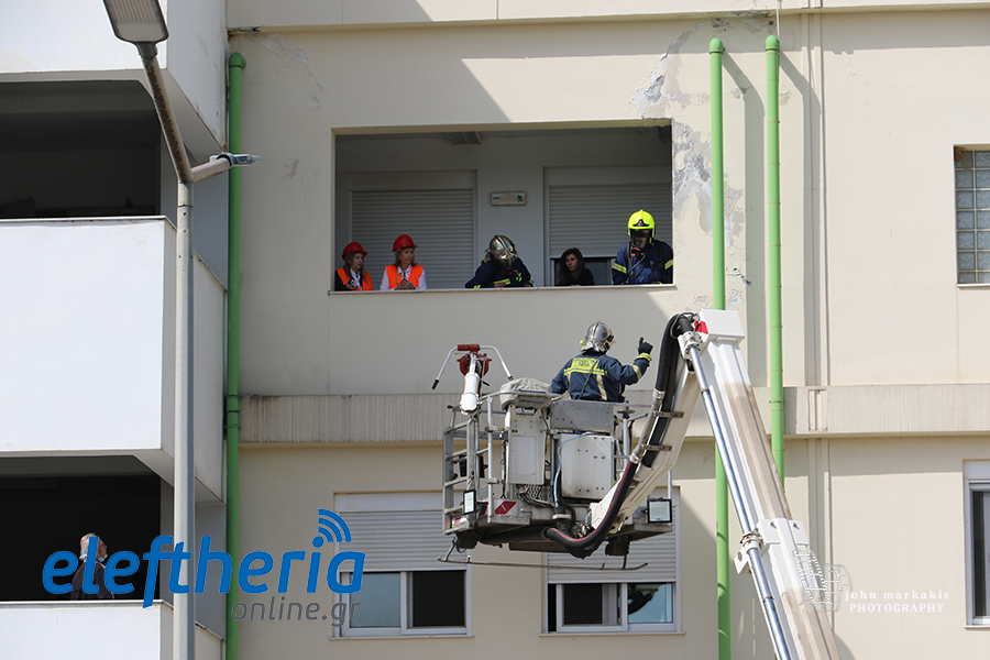 Το σενάριο της άσκησης περιελάμβανε και πρόκληση πυρκαγιάς και απεγκλωβισμό ατόμων από γερανοφόρο όχημα της Πυροσβεστικής Υπηρεσίας.