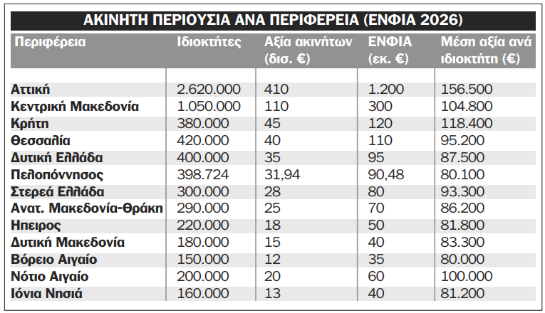 Σε πανελλαδικό επίπεδο, η συνολική αξία των ακινήτων φτάνει τα 782,5 δισ. ευρώ και κατανέμεται σε περισσότερους από 7,1 εκατ. ιδιοκτήτες. Η μεγαλύτερη συγκέντρωση καταγράφεται στην Αττική, όπου συγκεντρώνεται σχεδόν το μισό της συνολικής αξίας, ενώ ακολουθεί η Κεντρική Μακεδονία.
