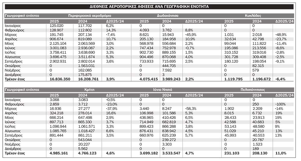 Παρά την ύπαρξη δύο διεθνών πυλών –Άραξος και Καλαμάτα– η Πελοπόννησος παραμένει στο περιθώριο των διεθνών αεροπορικών ροών. Σύμφωνα με τα στοιχεία του ΙΝΣΕΤΕ για το 2025 (τρέχον έτος), στα περιφερειακά αεροδρόμια της χώρας καταγράφηκαν 16.836.350 αφίξεις. Από αυτές, η Πελοπόννησος συγκεντρώνει μόλις 231.103, ποσοστό 1,37%. Την ίδια στιγμή, η Κρήτη προσελκύει 29,6%, τα Δωδεκάνησα 24,2%, τα Ιόνια Νησιά 22,0% και οι Κυκλάδες 6,65%.
