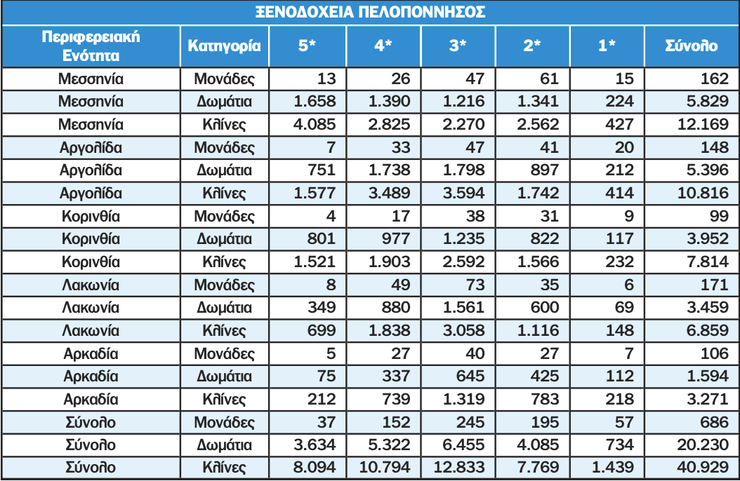 Αντίστοιχη είναι και η εικόνα στο ξενοδοχειακό δυναμικό, όπου η Μεσσηνία προηγείται, ακολουθούμενη από την Αργολίδα, την Κορινθία και τη Λακωνία. Η κατανομή αυτή δείχνει ότι το τουριστικό απόθεμα της Περιφέρειας δεν είναι μονοκεντρικό, αλλά με σαφή πυρήνα τη Μεσσηνία.