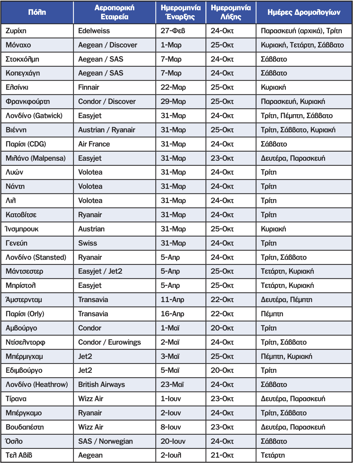 Στον πίνακα οι προγραμματισμένες πτήσεις σύμφωνα με έρευνα της «Ε» στις ιστοσελίδες των αεροπορικών εταιρειών. Η ταξινόμηση έχει γίνει με βάση την ημερομηνία έναρξης των δρομολογίων Οι ταξιδιώτες πρέπει να ενημερώνονται για τα τις πτήσεις από τις επίσημες ιστοσελίδες των εταιρειών γιατί ο προγραμματισμός των πτήσεων μπορεί να αλλάξει.