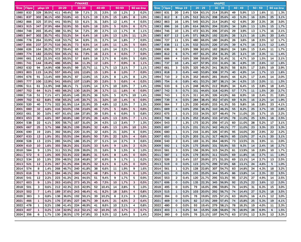 Από εκεί και πέρα αρχίζει η πραγματική ιστορία της ηλικιακής μετατόπισης. Για τους άνδρες το 1980 ο γάμος πριν τα 30 ήταν η κανονικότητα. Κάλυπτε το 65,5% των περιπτώσεων. Το 2024 το ίδιο ποσοστό πέφτει στο 21,1%, δηλαδή περίπου ένας στους πέντε. Το 1980 οι άνδρες ηλικίας 20–29 ετών αποτελούν το 63,1% και οι 30–39 ετών το 25,8%. Το 2024 η εικόνα ανατρέπεται. Οι 20–29 πέφτουν στο 21,1% και οι 30–39 ανεβαίνουν στο 54,7%. Ο κύριος όγκος του γάμου μετακινείται πλέον καθαρά στην τέταρτη δεκαετία της ζωής.