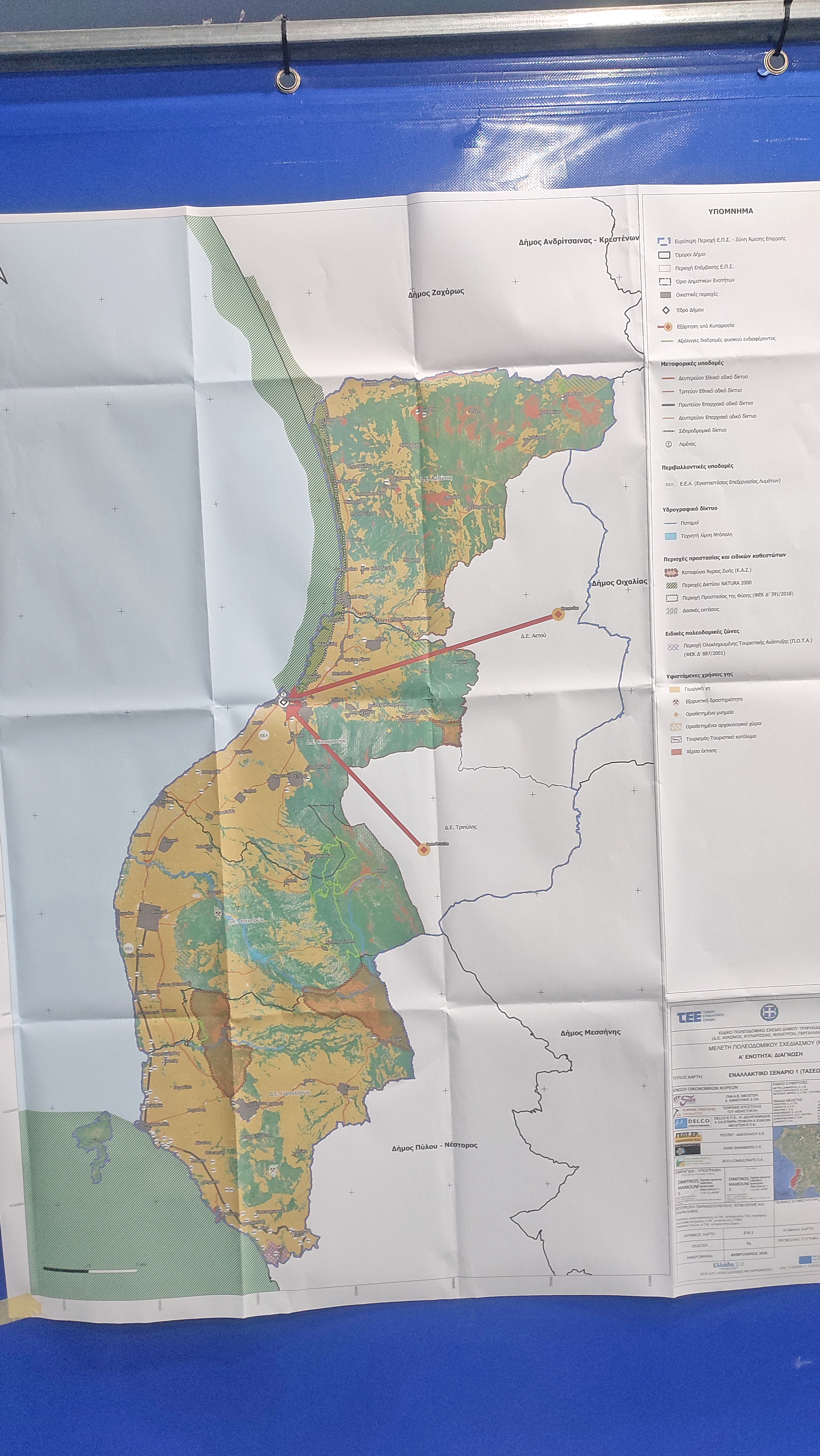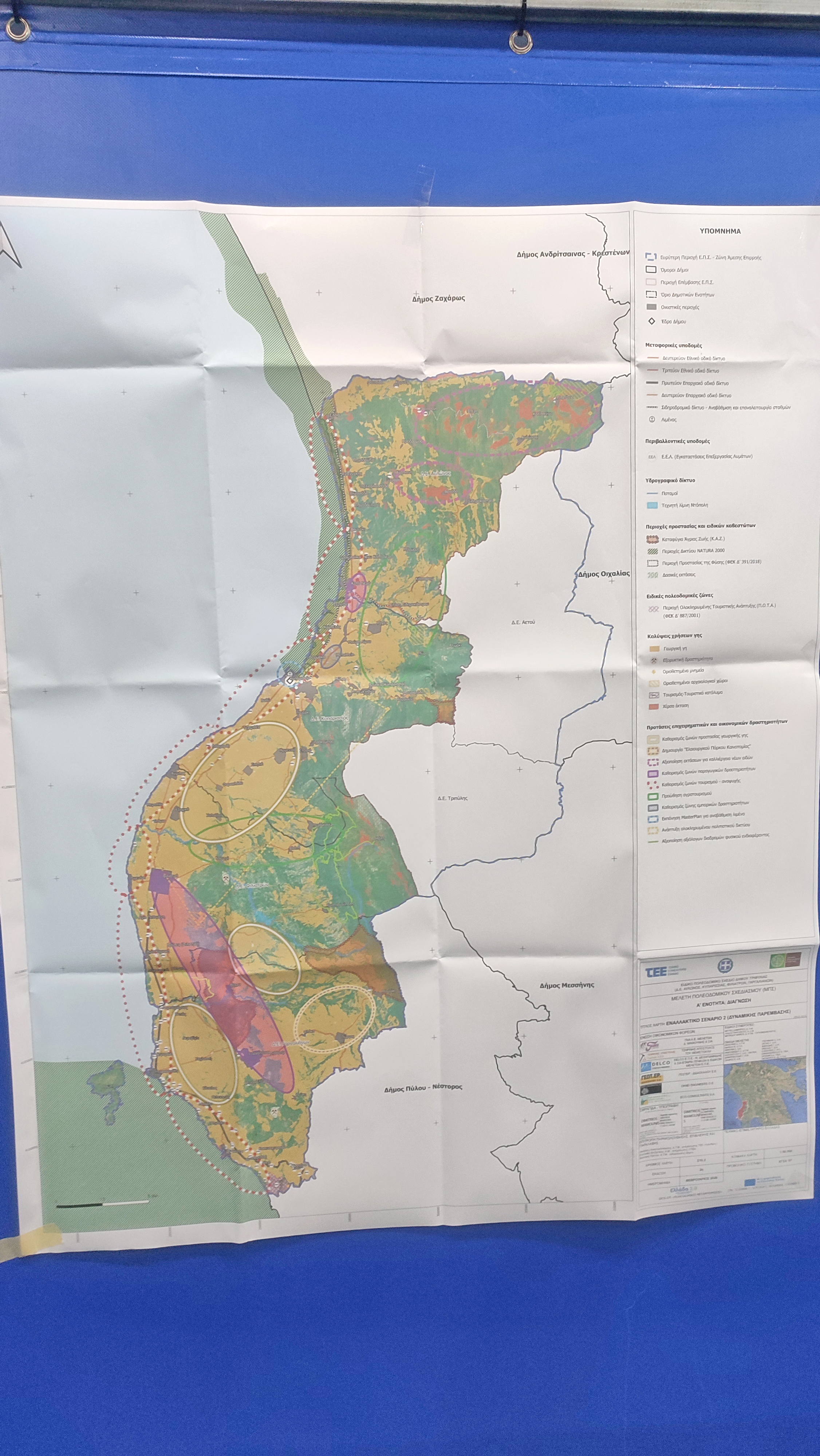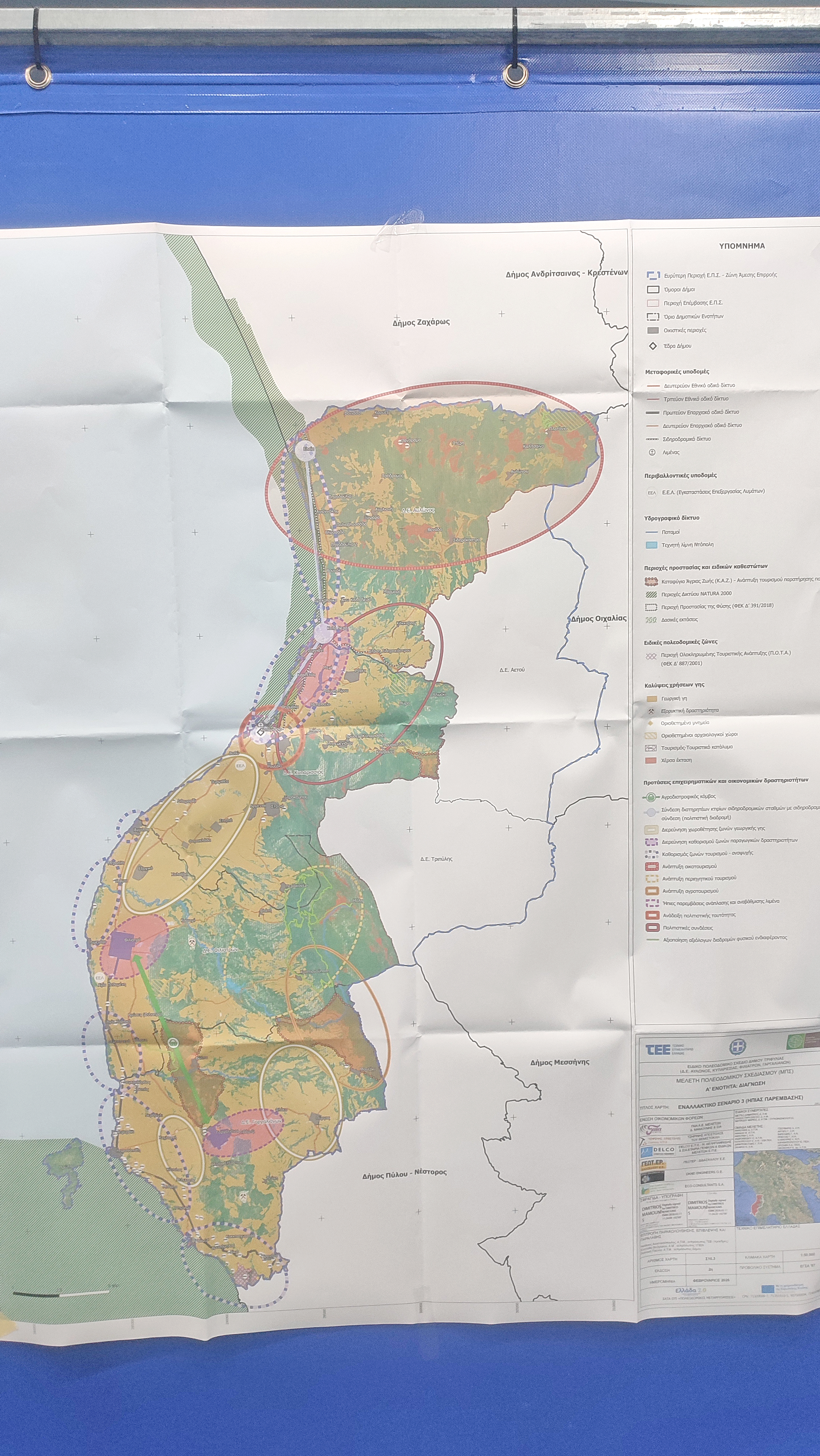 Σενάριο 2. Το σενάριο δυναμικής παρέμβασης αποτελεί ένα φιλόδοξο και ολοκληρωμένο αναπτυξιακό σενάριο για την περιοχή επέμβασης, το οποίο στηρίζεται στη συνδυασμένη ενίσχυση και των τριών τομέων παραγωγής. Κεντρικό ρόλο κατέχει ο τριτογενής τομέας, ο οποίος είναι ήδη ο πλέον ανεπτυγμένος στην περιοχή μελέτης, μέσω της οργάνωσης και θεσμοθέτησης ζωνών τουρισμού και αναψυχής, με στόχο την προσέλκυση δραστηριοτήτων, την ενίσχυση της τοπικής οικονομίας και την αύξηση του μόνιμου και εποχικού πληθυσμού. Παράλληλα, προωθείται η ενίσχυση του πρωτογενούς και του δευτερογενούς τομέα μέσω της εφαρμογής αυστηρής και σαφώς καθορισμένης ζωνοποίησης, με περιορισμό των μη συμβατών χρήσεων εντός των αντίστοιχων παραγωγικών ζωνών και την απαγόρευσή τους σε λοιπές περιοχές εκτός των προβλεπόμενων, με σκοπό τη λειτουργική οργάνωση του χώρου και την αποφυγή συγκρούσεων χρήσεων. Η εφαρμογή του σεναρίου δυναμικής παρέμβασης προϋποθέτει την υιοθέτηση νέων δράσεων, καθώς και κανονιστικών και νομοθετικών ρυθμίσεων, οι οποίες θα επιτρέψουν την υλοποίησή του σε σχετικά σύντομο χρονικό διάστημα, διασφαλίζοντας τον αναγκαίο συντονισμό των προτεινόμενων αναπτυξιακών παρεμβάσεων και των απαιτούμενων υποδομών. Κομβικό στοιχείο του σεναρίου αποτελεί η έγκαιρη εκπόνηση των αναγκαίων μελετών και η κατασκευή των προβλεπόμενων έργων υποδομής, τα οποία σε ορισμένες περιπτώσεις συνεπάγονται αυξημένο κόστος υλοποίησης. Παρότι στο πλαίσιο του σεναρίου προτείνεται η δυναμική ανάπτυξη και των τριών παραγωγικών τομέων, οι σχετικές παρεμβάσεις χαρακτηρίζονται από αυξημένο βαθμό δυσκολίας ως προς την εφαρμογή τους. Ενδεικτικά αναφέρεται η πρόταση χωροθέτησης ζωνών προστασίας γεωργικής γης και ζωνών παραγωγικών δραστηριοτήτων, με στόχο την αποτροπή διάσπαρτων και ασύμβατων χρήσεων στον εξωοικιστικό χώρο. Οι δυσχέρειες υλοποίησης σχετίζονται τόσο με το υψηλό κόστος των παρεμβάσεων όσο και με τις χρονοβόρες διαδικασίες εκπόνησης και έγκρισης μελετών, την κατασκευή έργων υποδομής, καθώς και την ανάγκη θεσμικών και διοικητικών προσαρμογών. Σε επίπεδο χωρικής οργάνωσης, το σενάριο προβλέπει αυστηρή οριοθέτηση των ζωνών χρήσεων γης με περιορισμό των ασύμβατων χρήσεων, καθώς και την εκπόνηση Ρυμοτομικών Σχεδίων Εφαρμογής και την ανάπλαση κοινόχρηστων χώρων και κεντρικών οδών στους οικισμούς. Παράλληλα, η ενίσχυση της διασύνδεσης του πρωτογενούς τομέα με τη μεταποίηση και τον τουρισμό, η ανάδειξη της τοπικής αγροδιατροφικής ταυτότητας, η αξιοποίηση της διεθνούς ακτινοβολίας της Π.Ο.Τ.Α. Μεσσηνίας και η ανάπτυξη νέων μορφών θεματικού τουρισμού δημιουργούν τις προϋποθέσεις για έναν ουσιαστικό αναπτυξιακό μετασχηματισμό της περιοχής, με τη μέγιστη αξιοποίηση των συγκριτικών πλεονεκτημάτων και τη συνολική αναδιάρθρωση του παραγωγικού προτύπου ανάπτυξης. Συνολικά, το σενάριο δυναμικής παρέμβασης αναμένεται να επιφέρει σημαντικές οικονομικές, κοινωνικές, περιβαλλοντικές και χωρικές αλλαγές, οδηγώντας σε επιταχυνόμενη αναπτυξιακή πορεία. Ωστόσο, η φιλόδοξη φύση του ενδέχεται να δημιουργήσει ζητήματα ρεαλιστικότητας και κοινωνικές αντιδράσεις σε περιπτώσεις μεταβολής καθιερωμένων πρακτικών. Παρά τις δυσκολίες αυτές, σε επιμέρους τομείς, όπως η προστασία και ανάδειξη του φυσικού περιβάλλοντος, το σενάριο παρουσιάζει σαφώς θετικές πτυχές, συχν