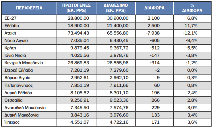 Στην Αττική το πρωτογενές εισόδημα ανήλθε σε περίπου 73,5 δισ. PPS, ενώ το διαθέσιμο εισόδημα διαμορφώθηκε σε 65,6 δισ. PPS. Δηλαδή παράγεται περισσότερος πλούτος από αυτόν που τελικά παραμένει στην περιοχή, γεγονός που συνδέεται με τη μεταφορά φορολογικών πόρων προς τις υπόλοιπες περιφέρειες μέσω του συστήματος αναδιανομής.