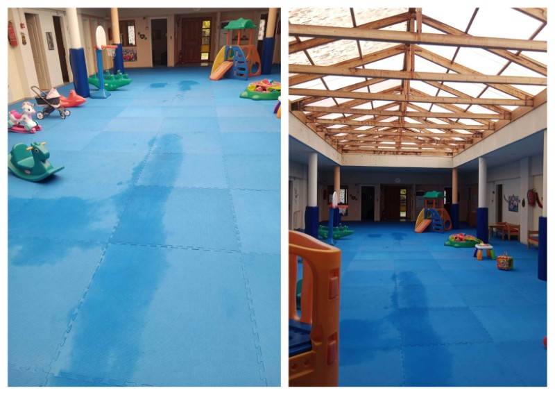 Σε ανακοίνωσή της αναφέρει ότι “την ώρα της βροχής η στέγη, που είναι φτιαγμένη από πολυκαρμπονικό πάνελ, έχει πολλές διαρροές, με αποτέλεσμα το προσωπικό να μαζεύει με κουβάδες το νερό. Παρά τις παρεμβάσεις που έγιναν στον εσωτερικό χώρο, η κατάσταση του κτηρίου συνεχίζει να είναι άσχημη. Εξωτερικά το κτήριο μοιάζει σαν εγκαταλελειμμένο, υπάρχουν παντού σημάδια υγρασίας, ενώ σε κάποια σημεία είναι ορατά τα σίδερα του τοίχου, πράγμα που εγείρει ανησυχίες για την ασφάλεια των παιδιών και του προσωπικού.