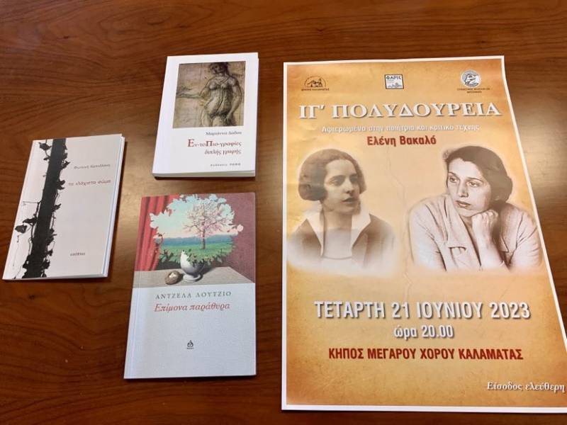 Τα ΙΓ’ Πολυδούρεια, αφιερωμένα στην ποιήτρια και εικαστικό τέχνης, Ελένη Βακαλό θα συνδιοργανώσουν σήμερα στις 8 μ.μ. ο Δήμος Καλαμάτας, η Κοινωφελής Επιχείρηση του Δήμου Καλαμάτας «Φάρις» και ο Σύνδεσμος Φιλολόγων Μεσσηνίας, στον κήπο του Μεγάρου Χορού Καλαμάτας.