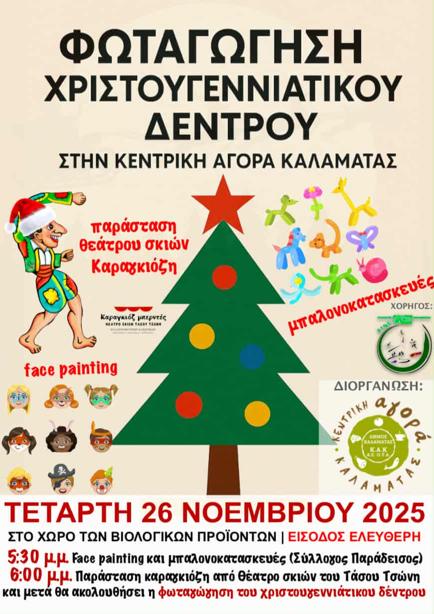 Εορταστική εκδήλωση για τη φωταγώγηση του Χριστουγεννιάτικου δέντρου και του εορταστικού φωτισμού θα πραγματοποιηθεί την Τετάρτη 26 Νοεμβρίου 2025 το απόγευμα, στην Κεντρική Αγορά Καλαμάτας.