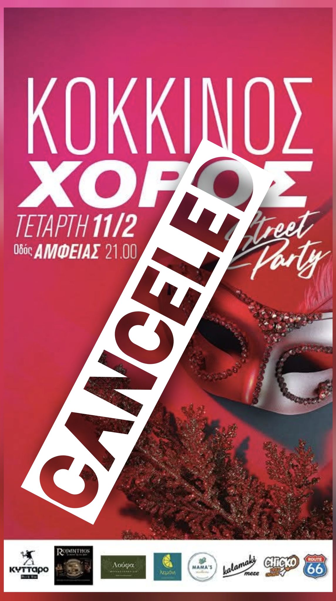 Αναβάλλεται ο προγραμματισμένος για σήμερα «Κόκκινος Χορός», που επρόκειτο να πραγματοποιηθεί στον πεζόδρομο της Αμφείας, στο πλαίσιο των εκδηλώσεων του Καλαματιανού Καρναβαλιού.