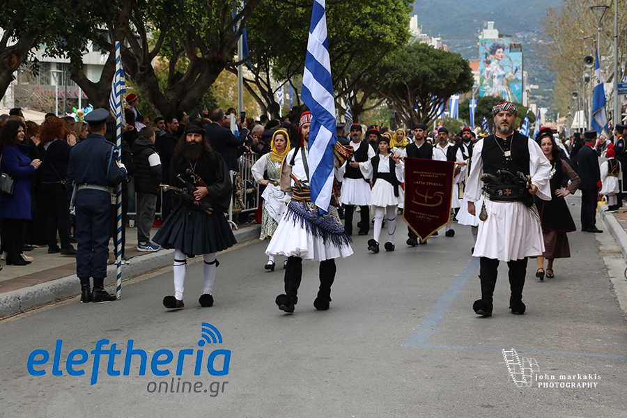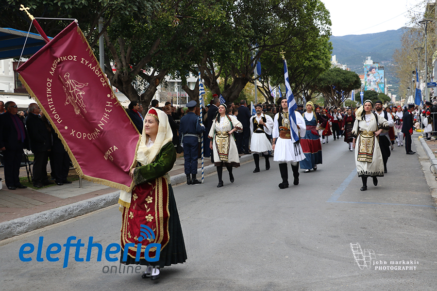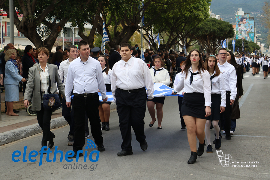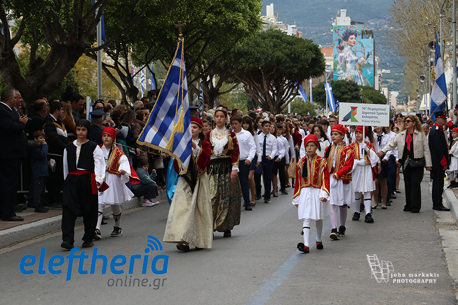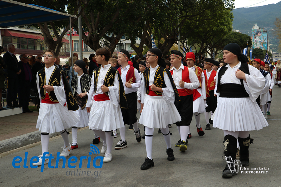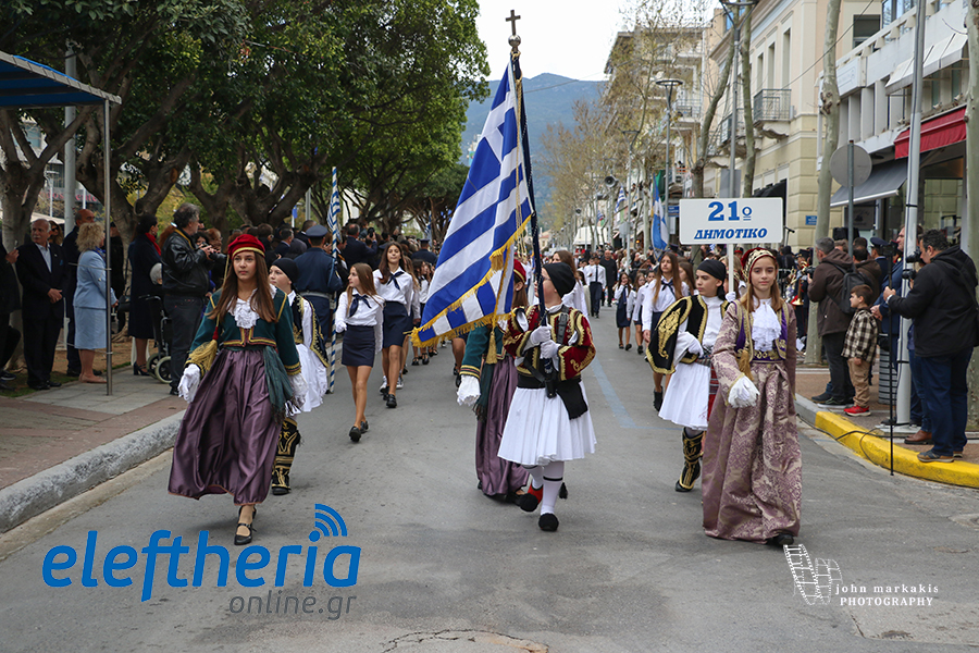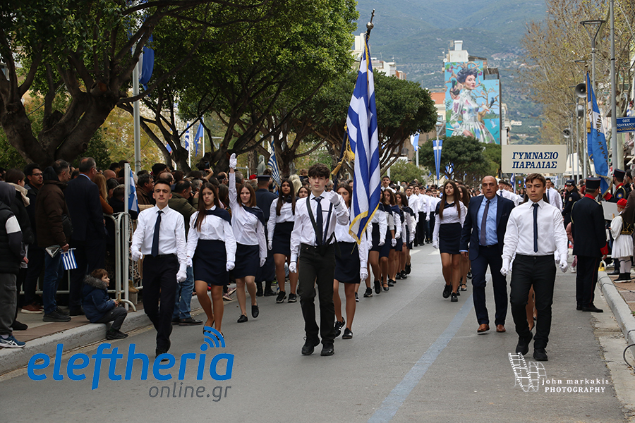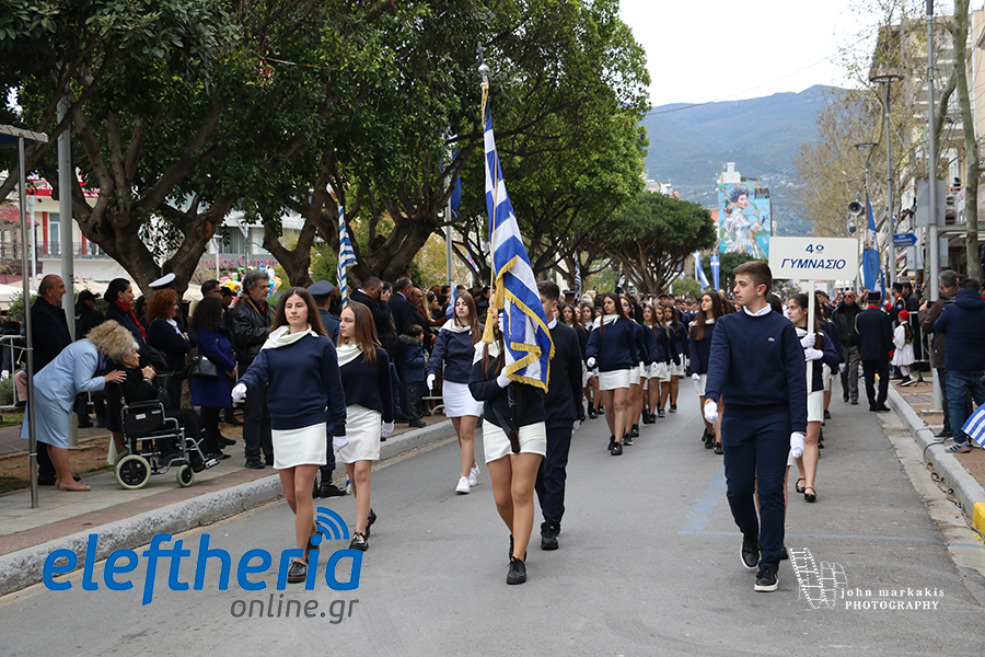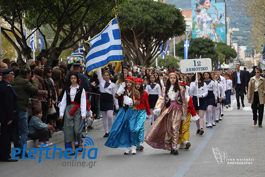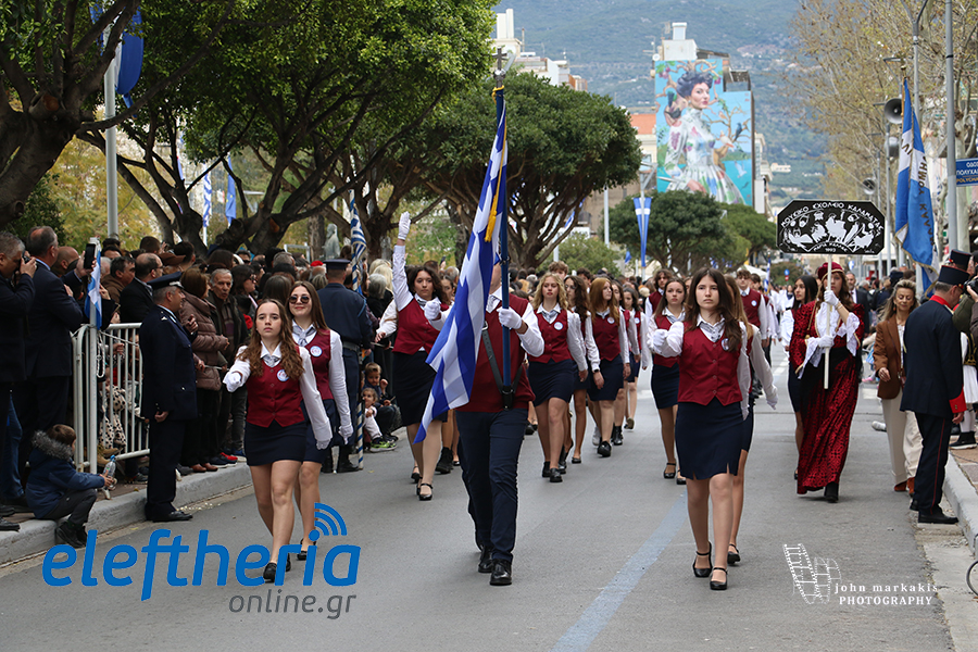 Παρότι ο καιρός δεν ήταν ο ιδανικός, πλήθος κόσμου παρακολούθησε τη μαθητική παρέλαση, στον πεζόδρομο και την οδό Αριστομένους, στην οποία όπως κάθε χρόνο συμμετείχαν και μέλη αρκετών λαογραφικών και άλλων συλλόγων, καθώς και στρατιωτικά και μηχανοκίνητα τμήματα. Σε ό,τι έχει να κάνει με την Φιλαρμονική, έδωσε μεν το παρών στην παρέλαση αλλά όχι σύσσωμη, λόγω της απεργίας του Σωματείου.