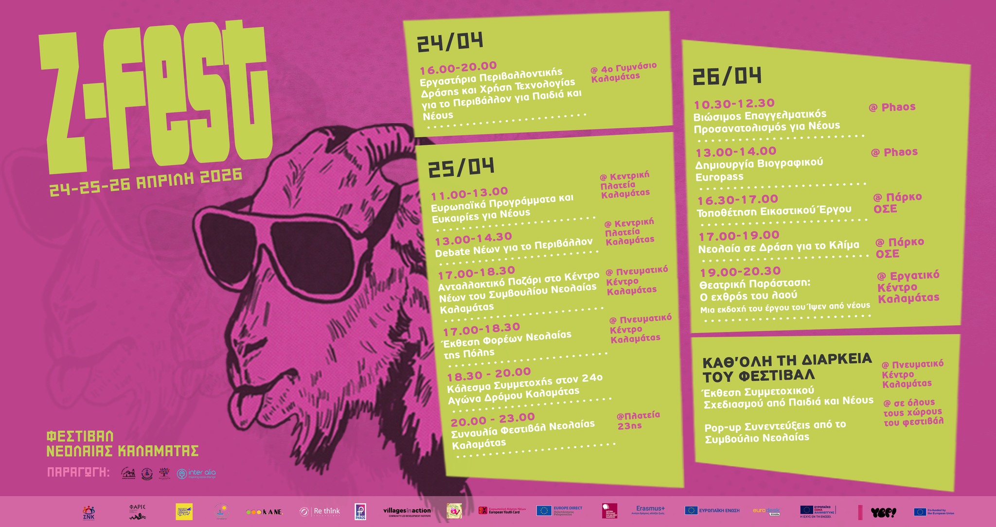 Η έναρξη του Z-FEST θα γίνει την Παρασκευή 24 Απριλίου, από τις 4 μ.μ. έως τις 8 μ.μ., στο 4ο Γυμνάσιο Καλαμάτας, με μια σειρά από διαδραστικά εργαστήρια και παρουσιάσεις γύρω από την περιβαλλοντική δράση και τη χρήση της τεχνολογίας για το περιβάλλον. Μέσα από σύντομες και συμμετοχικές δράσεις διάρκειας 20 έως 35 λεπτών, οι συμμετέχοντες θα έρθουν σε επαφή με θεματικές όπως η κλιματική δράση, η βιωσιμότητα, η καινοτομία, η πολιτιστική κληρονομιά και η ενδυνάμωση των νέων. Στη διοργάνωση συμμετέχουν, μεταξύ άλλων, το 4ο και το 5ο Γυμνάσιο Καλαμάτας, το ΚΕΠΕΑ Καλαμάτας, οι Villages in Action, η ΚΑΝΕ και ο Δήμος Καλαμάτας. Το Σάββατο 25 Απριλίου το πρόγραμμα μεταφέρεται στην Κεντρική Πλατεία Καλαμάτας, όπου από τις 11 π.μ. έως τη 1 μ.μ. θα πραγματοποιηθεί διαδραστική παρουσίαση για τα ευρωπαϊκά προγράμματα και τις ευκαιρίες που προσφέρονται στους νέους ηλικίας 13 έως 29 ετών. Η δράση θα εστιάσει σε πρωτοβουλίες όπως το Erasmus+, το Ευρωπαϊκό Σώμα Αλληλεγγύης και η Ευρωπαϊκή Κάρτα Νέων, ενώ στο τέλος της παρουσίασης θα διατεθούν δωρεάν 50 Ευρωπαϊκές Κάρτες Νέων στο κοινό. Αμέσως μετά, από τη 1 μ.μ. έως τις 2.30 μ.μ., θα ακολουθήσει debate νέων για το περιβάλλον, με τη συμμετοχή δύο ομάδων που θα αναπτύξουν επιχειρήματα και προβληματισμούς γύρω από την κλιματική κρίση και τα οικολογικά ζητήματα. Τη δράση υλοποιεί ο Ρητορικός Όμιλος του Πανεπιστημίου Πελοποννήσου. Το απόγευμα της ίδιας ημέρας, από τις 5 μ.μ. έως τις 6.30 μ.μ., στον αναδιαμορφωμένο χώρο νέων του Συμβουλίου Νεολαίας Καλαμάτας, στο Αναγνωστήριο του Πνευματικού Κέντρου, θα πραγματοποιηθεί ανταλλακτικό παζάρι με βιβλία, επιτραπέζια παιχνίδια και ρούχα. Οι ενδιαφερόμενοι θα μπορούν να φέρουν έως τρία αντικείμενα σε καλή κατάσταση και να επιλέξουν έως τρία άλλα, ενώ θα υπάρχει και η δυνατότητα δωρεάς βιβλίων και επιτραπέζιων παιχνιδιών για τον χώρο. Την ίδια ώρα, στο φουαγιέ του Πνευματικού Κέντρου, θα φιλοξενηθεί έκθεση φορέων και συλλογικοτήτων νεολαίας της πόλης, με στόχο τη δικτύωση και την ενημέρωση των νέων για διαθέσιμες δράσεις και ευκαιρίες συμμετοχής. Στις 6.30 μ.μ., το Συμβούλιο Νεολαίας Καλαμάτας απευθύνει ανοιχτό κάλεσμα συμμετοχής στον 24ο Αγώνα Δρόμου Καλαμάτας, με σημείο εκκίνησης την Κεντρική Πλατεία, ενισχύοντας έτσι τη σύνδεση του φεστιβάλ με τον αθλητισμό και την ενεργό συμμετοχή στην τοπική κοινωνία. Η ημέρα θα ολοκληρωθεί με τη ζωντανή εμφάνιση μαθητικών μουσικών σχημάτων από σχολεία της περιοχής, από τις 8 μ.μ. έως τις 11 μ.μ. στην Πλατεία 23ης, δίνοντας χώρο στη νεανική καλλιτεχνική έκφραση και δημιουργία.
