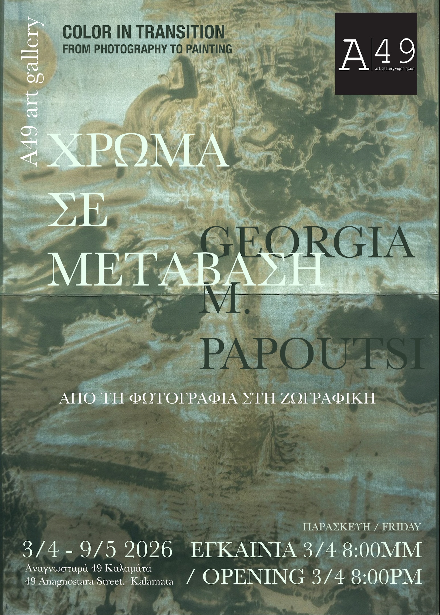 Η έκθεση, που θα διαρκέσει έως το Σάββατο 9 Μαΐου, είναι επισκέψιμη στον χώρο τέχνης Α49, Αναγνωσταρά 49, στην Καλαμάτα, από Δευτέρα έως Παρασκευή, 11 π.μ. - 2 μ.μ. και 6 μ.μ. - 9 μ.μ., καθώς και το Σάββατο, 11 π.μ. - 2 μ.μ. Την Κυριακή ο χώρος παραμένει κλειστός.