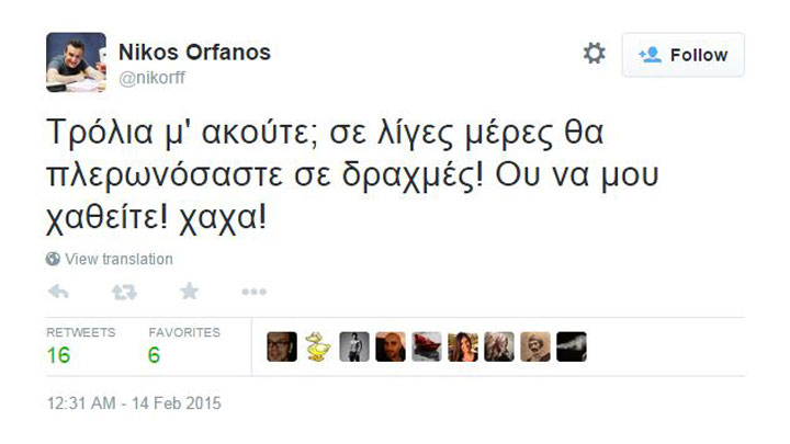 Ο Νίκος Ορφανός απευθύνθηκε στα «troll» του Twitter, λέγοντας πως «σε λίγες μέρες» θα... πληρώνονται σε δραχμές!