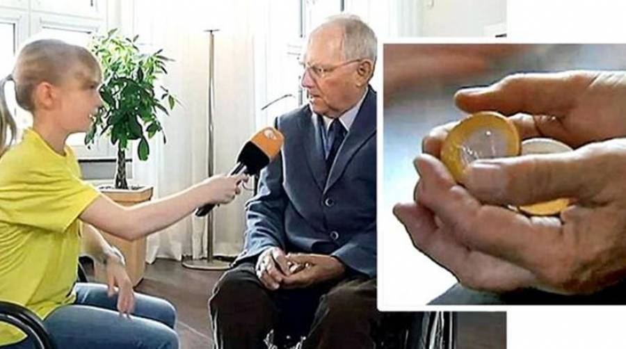 Η κουβέντα για την Ελλάδα ξεκίνησε όταν η μικρή ρεπόρτερ ρώτησε τον Γερμανό υπουργό για το ύψος της Γερμανίας. Αφού ο Σόιμπλε παραδέχθηκε ότι το ύψος του «προκαλεί ίλιγγο» καθώς είναι της τάξης του 1,4 τρισ. ευρώ ξεκίνησε τα «καρφιά»: μην ανησυχείς εμείς το αποπληρώνουμε πάντα, αν κάποιος, όμως, ξοδεύει περισσότερα από όσα βγάζει τότε κάποια στιγμή θα κινδυνεύσει και εμείς αυτό δεν το κάνουμε.