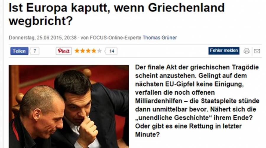 «H τελευταία πράξη της τραγωδίας: Έρχεται το τέλος της Ευρώπης εάν η Ελλάδα ξεφύγει;», διερωτάται το γερμανικό περιοδικό «Focus» σχολιάζοντας το αδιέξοδο στις χθεσινές συνομιλίες. Ένα Grexit που πλέον είναι περισσότερο ορατό θα είχε καταστροφικές συνέπειες για τη γηραιά ήπειρο;, σχολιάζει το περιοδικό.