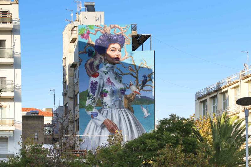 Η μνημειακών διαστάσεων γυναικεία φιγούρα, με στοιχεία που παραπέμπουν στη δραματική περσόνα και τη λυρική αύρα της εποχής της Divina (Callas), δεσπόζει στο κέντρο του κτηρίου σαν μια ζωντανή υπενθύμιση της δύναμης της τέχνης να μεταμορφώνει το αστικό τοπίο.