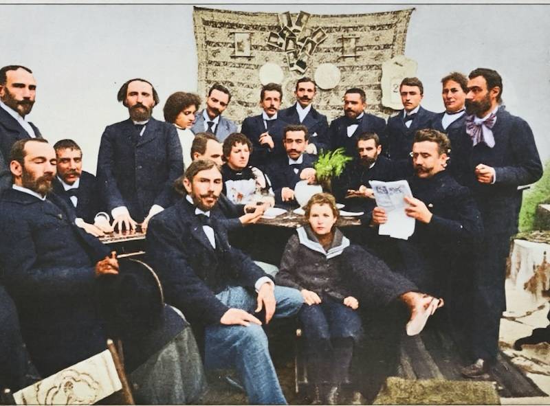 Διακρίνονται: Ι. Δαμβέργης, Μπάμπης Άννινος, Γεώργιος Ροϊλός, Άδωνις Κύρου, Κρίτων Σουρής (γιος του Σουρή), Κωστής Παλαμάς, Γεώργιος Στρατήγης, Ιωάννης Πολέμης, Περικλής Γιαννόπουλος, ο ίδιος ο ποιητής, η κόρη του Έλλη Σουρή-Μοσχονά, ο Γρηγόριος Ξενόπουλος, ο Γεώργιος Πωπ, ο Μιλτιάδης Μαλακάσης, ο Γεράσιμος Βώκος, ο Ιωάννης Παπαδιαμαντόπουλος (Ζαν Μωρεάς), η Δέσποινα Κωνσταντινίδου (πεθερά του Γεωργίου Σουρή) και ο Ανδρέας Καρκαβίτσας).