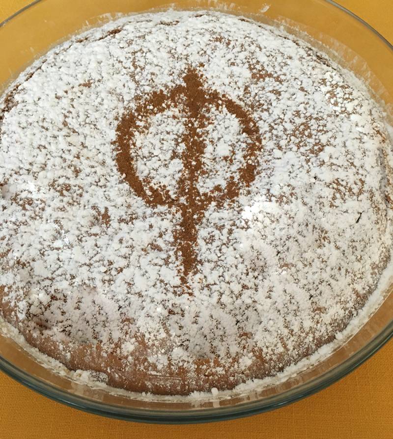 - Όταν κρυώσει, κοσκινίζουμε την επιφάνεια με ζάχαρη άχνη και λίγη κανέλλα και κόβουμε την πίτα σε τετράγωνα κομμάτια.