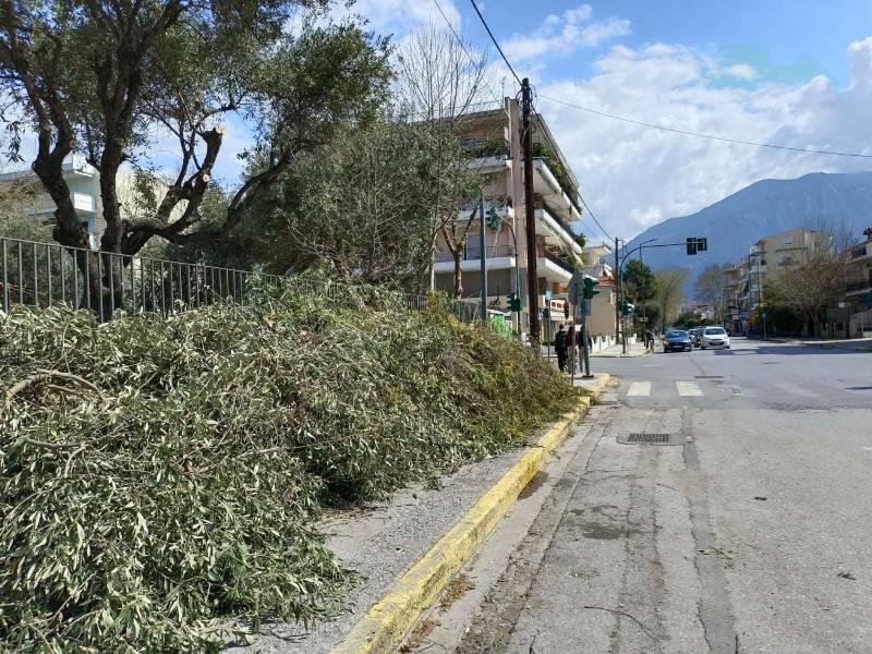Στην περίπτωση του 7ου Δημοτικού Σχολείου Καλαμάτας, στην πλευρά της οδού Κρήτης, το πεζοδρόμιο παραμένει εδώ και μέρες πλήρως κατειλημμένο από κλαδιά, χωρίς καμία μέριμνα για την απομάκρυνσή τους.