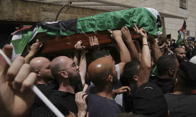 Πλάνα που μετέδωσε το δίκτυο Palestine TV δείχνουν το φέρετρο της δημοσιογράφου του Αλ Τζαζίρα, που σκοτώθηκε προχθές Τετάρτη στη διάρκεια μιας ισραηλινής επιδρομής στη Δυτική Όχθη, να κινδυνεύει να πέσει στο έδαφος ενώ Ισραηλινοί αστυνομικοί διαλύουν το πλήθος.