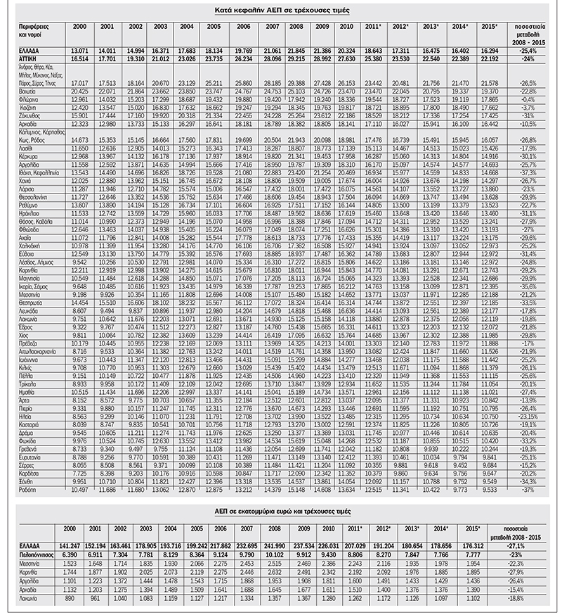 Μικρότερη (21,2%) ήταν η μείωση του κατά κεφαλήν ΑΕΠ, καθώς το 2008 ανερχόταν σε 15.480 ευρώ και το 2015 μειώθηκε στα 12.188 ευρώ.