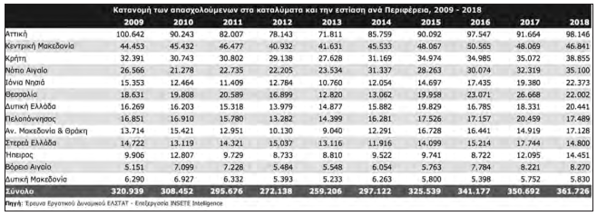 Συγκεκριμένα και σύμφωνα με μελέτη του ΙΝΣΕΤΕ: “Οι απασχολούμενοι στον κλάδο του τουρισμού το 2018 ήταν 361.676 σημειώνοντας αύξηση κατά +12,7% σε σύγκριση με το 2009 (321.000). Αναφορικά με την περιφερειακή κατανομή των απασχολούμενων το 2018 στον κλάδο του τουρισμού, παρατηρούμε ότι η πλειοψηφία των απασχολούμενων καταγράφονται στις Περιφέρειες Αττικής (27,1%) και Κεντρικής Μακεδονίας (12,9%), όπου συναντώνται τα 2 μεγάλα αστικά κέντρα της Ελλάδας. Ακολουθούν οι τουριστικές Περιφέρειες της χώρας, Κρήτη (10,7%), Νότιο Αιγαίο (9,7%) και Ιόνια Νησιά (6,2%), Περιφέρειες οι οποίες δέχονται το 43,1% των επισκέψεων της χώρας. Επόμενες κατά σειρά είναι οι Περιφέρειες της Θεσσαλίας (6,1%), της Δυτικής Ελλάδας (5,7%), της Πελοποννήσου (4,8%), της Αν. Μακεδονίας & Θράκης (4,7%), της Στερεάς Ελλάδας (4,1%), της Ηπείρου (4,0%), του Βορείου Αιγαίου (2,3%) ενώ στην τελευταία θέση βρίσκεται η Περιφέρεια της Δυτικής Μακεδονίας (1,6%).