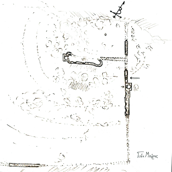 Το κάστρο που στεφάνωνε την κορυφή του υψώματος, φαίνεται ότι ήταν προσανατολισμένο από τα βορειοανατολικά προς τα νοτιοδυτικά. Από τα σχετικά λιγοστά ερείπια διατηρούνται καλύτερα σήμερα αυτά στο βορειοανατολικό τμήμα του, πάνω από το ρέμα του Λαγού. Εκεί φαίνεται ότι ήταν και η κεντρική πύλη του κάστρου, δίπλα στον ψηλό, τετράπλευρο πύργο. Σήμερα αυτή η πύλη είναι κλεισμένη πρόχειρα μέχρι τη μέση της με ξερολιθιά. Ενα μικρό δείγμα του τείχους του είναι αυτό που “κατηφορίζει” στη νοτιοανατολική πλαγιά, σαν συνέχεια του διώροφου πύργου της πύλης. Το χτίσιμό του παραπέμπει στην εποχή της Φραγκοκρατίας. Στο εσωτερικό αυτού του τείχους διακρίνονται δυο ανοίγματα του πύργου, μια μισογκρεμισμένη ισόγεια είσοδος και ένα παράθυρο, που βλέπουν στα νοτιοδυτικά. Ενα ακόμα τοξοειδές άνοιγμα, παράθυρο προς το βορρά πάνω από την πύλη του κάστρου, υπάρχει και στην εξωτερική πλευρά του πύργου, στο ύψος του ορόφου του. Η κάτοψη του πύργου είναι τετράγωνη και οι εσωτερικές διαστάσεις του σχετικά μικρές, περίπου ενάμισι επί ενάμισι μέτρο. Χαμηλότερα και στην εσωτερική επιφάνεια του τείχους, διακρίνονται δυο τοξοειδείς καμάρες σαν εσοχές, “κρύπτες” ή πολεμίστρες του τείχους. Ακόμα δυο χαμηλότερα τοξοειδή ανοίγματα με ύψος περίπου ογδόντα εκατοστών, υπάρχουν στις δυο πλευρές της εισόδου του τετράπλευρου πύργου.
