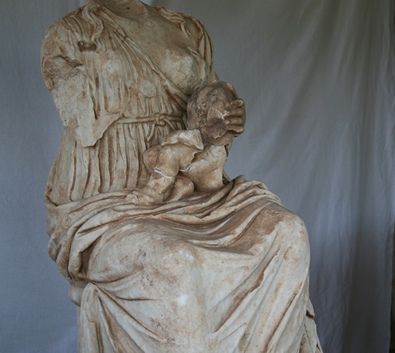 Από τα έργα που αποκαλύφθηκαν στις ανασκαφές της Αρχαίας Μεσσήνης ιδιαίτερα σημαντικό και πολυσήμαντο, παρά τα σπασίματα και τις ελλείψεις, είναι το άγαλμα της θεάς Ισιδας, που καθισμένη θηλάζει το παιδί της, τον Ωρο (Εικ. 2). Αυτό το πρωτότυπο σε σύλληψη και πλήρως εξελληνισμένο άγαλμα της πανάρχαιας αιγυπτιακής θεότητας, αποτελεί έργο άριστης τέχνης των πρώιμων ρωμαϊκών χρόνων. Με το αριστερό χέρι αγγίζει τρυφερά την πλάτη του παιδιού της, ενώ εκείνο καθισμένο στην αγκαλιά της μητέρας του ακουμπά το υψωμένο δεξί του στο αριστερό γυμνό στήθος της.